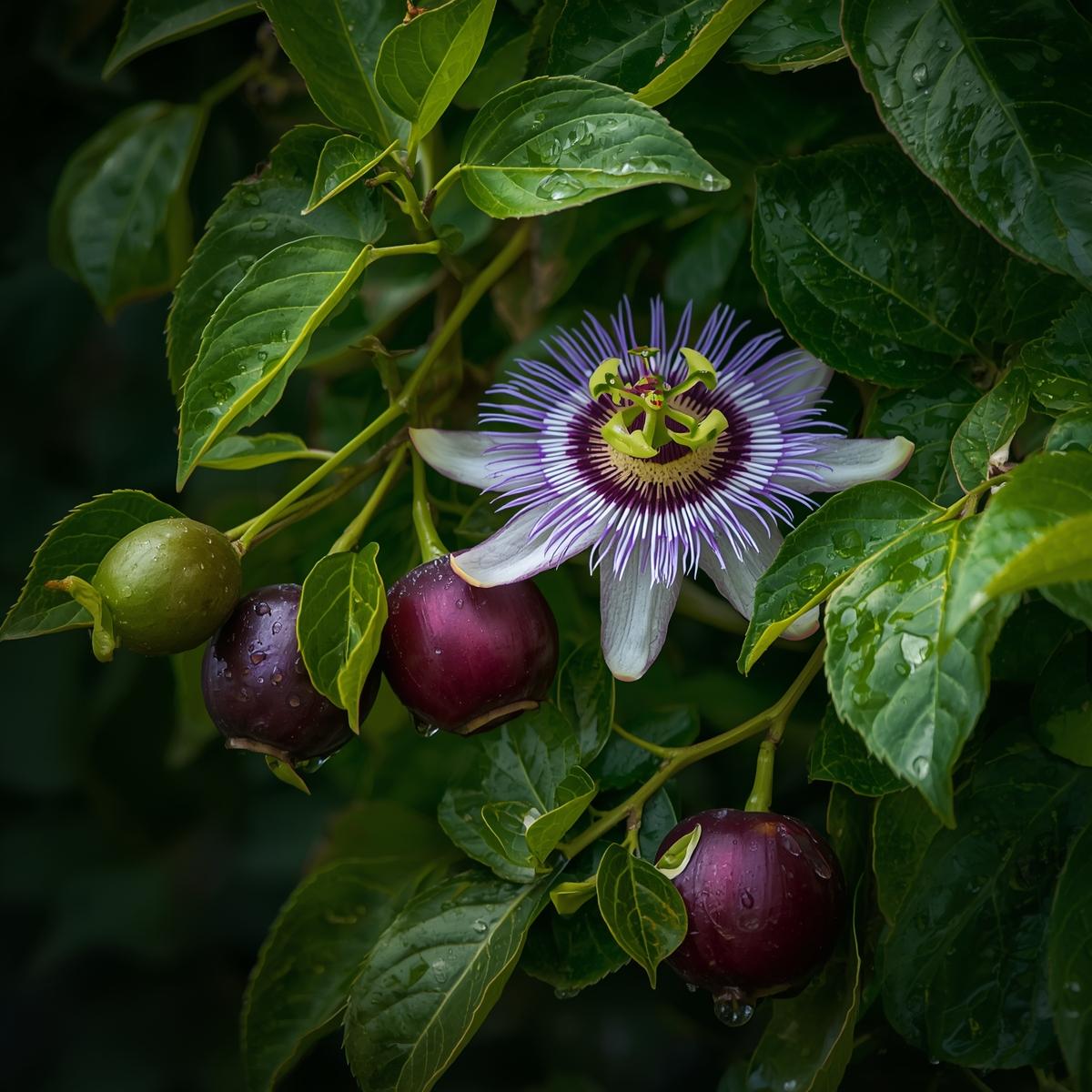 Cuando la planta está sana y la polinización funciona bien, aparecen los frutos. Dependiendo de la especie o variedad, estos pueden ser morados, púrpuras o amarillos, y al madurar desarrollan ese aroma intenso tan característico del maracuyá.