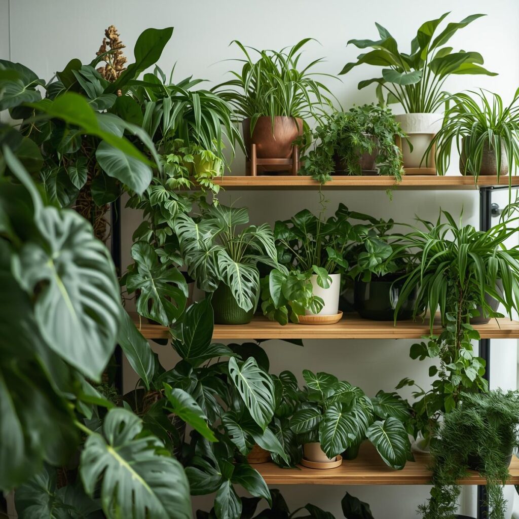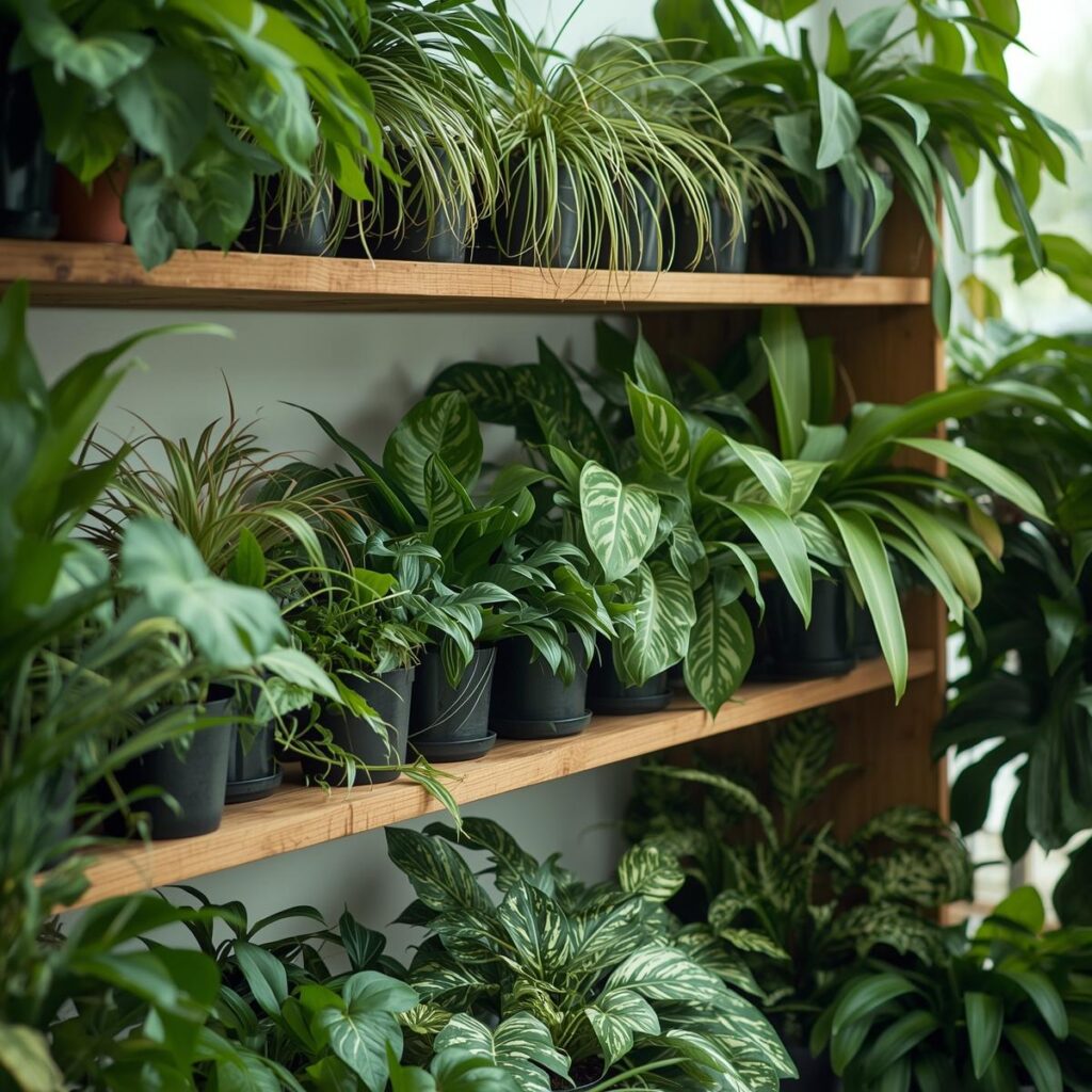 La mayoría de estanterías están en luz media: habitaciones claras, pero sin sol directo. Aquí funcionan plantas resistentes, que se adaptan y no exigen un cuidado constante.